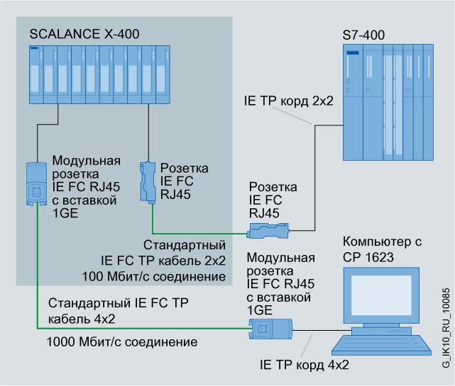 Пример применения модульных соединителей IE FC RJ45 в100 и 1000 Мбит/с сетях