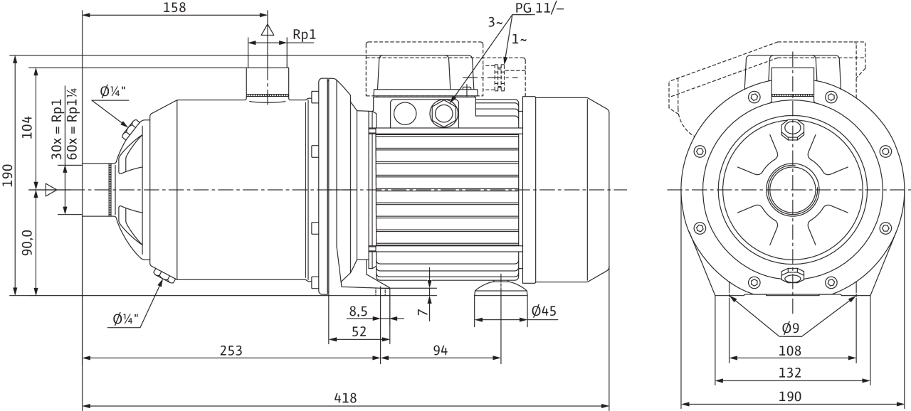 Многоступенчатый нормальновсасывающий горизонтальный высоконапорный центробежный насос блочного типа с низким уровнем шума с горизонтальным всасывающим и вертикальным напорным патрубком. Со сквозным насосным валом электродвигателя и не зависящим от направления вращения скользящим торцовым уплотнением.