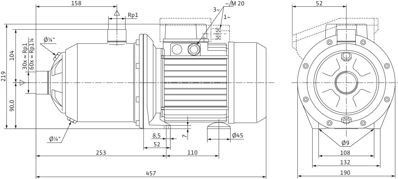 Многоступенчатый нормальновсасывающий горизонтальный высоконапорный центробежный насос блочного типа с низким уровнем шума с горизонтальным всасывающим и вертикальным напорным патрубком. Со сквозным насосным валом электродвигателя и не зависящим от направления вращения скользящим торцовым уплотнением.