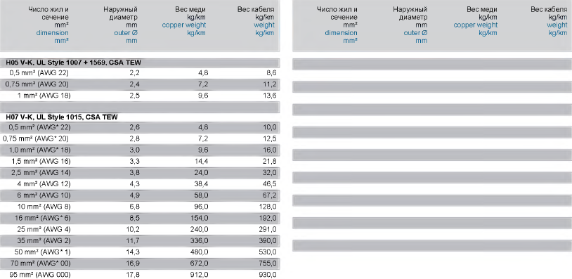 | Артикул | Название | Информация | Диаметр | Размеры | Вес меди | Вес кабеля |