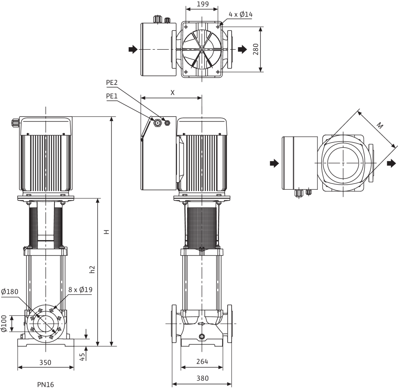 Многоступенчатый нормальновсасывающий вертикальный высоконапорный центробежный насос линейного типа со встроенным частотным преобразователем с воздушным охлаждением. Встроенный частотный преобразователь позволяет осуществлять плавную регулировку частоты вращения, давления и ПИД-регулировку.