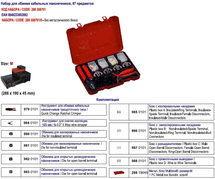 Набор для обжима кабельных наконечников.87 предметов. Код заказа 288308701