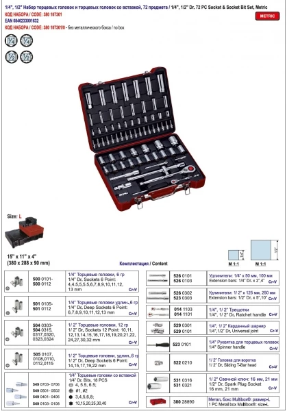 Набор торцевых головок и торцевых головок со вставкой, метрический, 72 предмета,1/4", 1/2".Код заказа 380107301