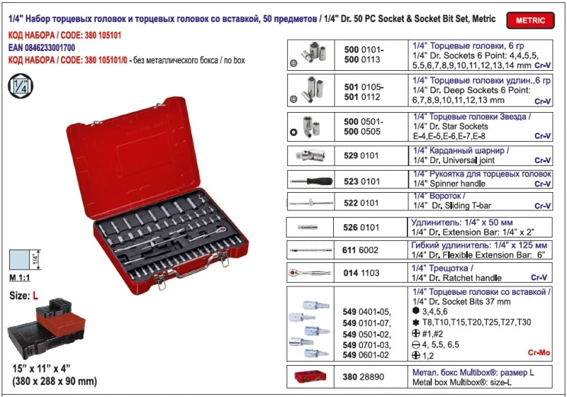 Набор торцевых головок и торцевых головок со вставкой, метрический, 50 предметов,1/4".Код заказа 380105101