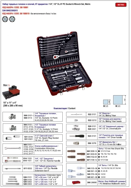 Набор универсальных торцевых головок и ключей, метрический, 87 предметов,1/4", 1/2". Код заказа 380108801