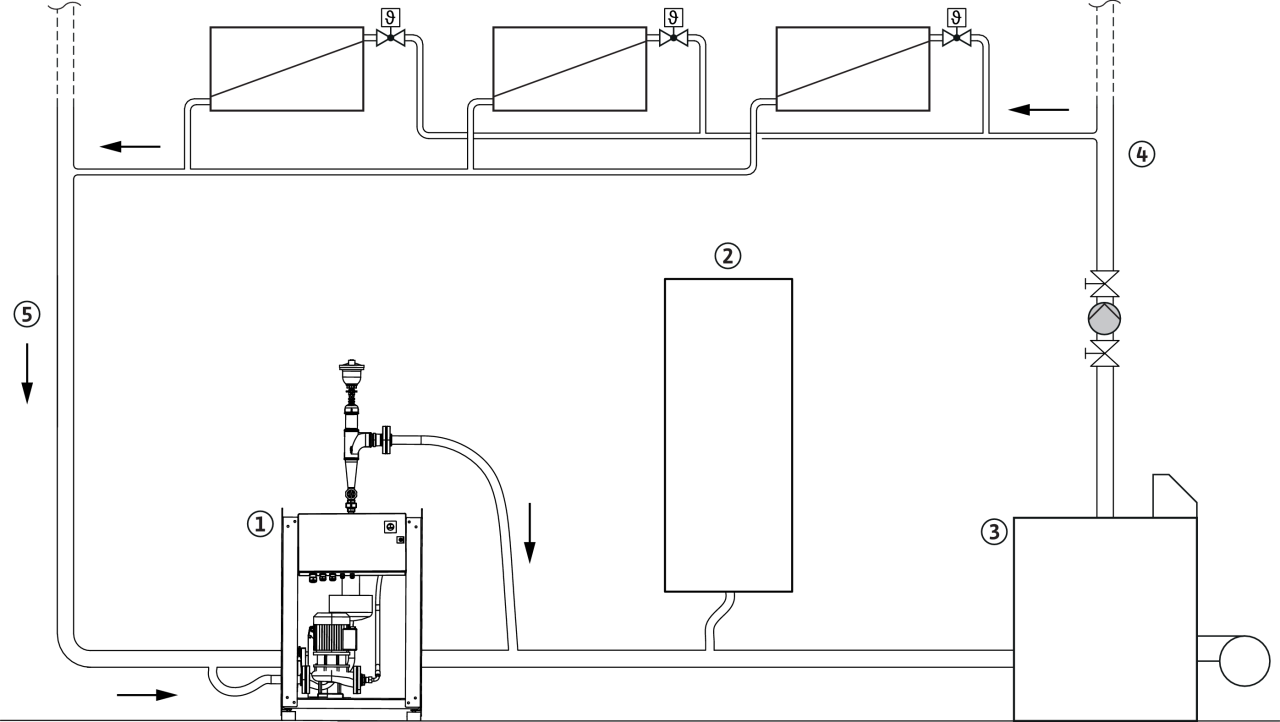 Интеграция Wilo-SiClean Comfort в систему отопления выполняется в виде установки байпаса в обратном трубопроводе отопительного контура.