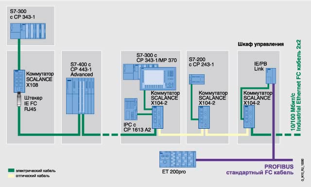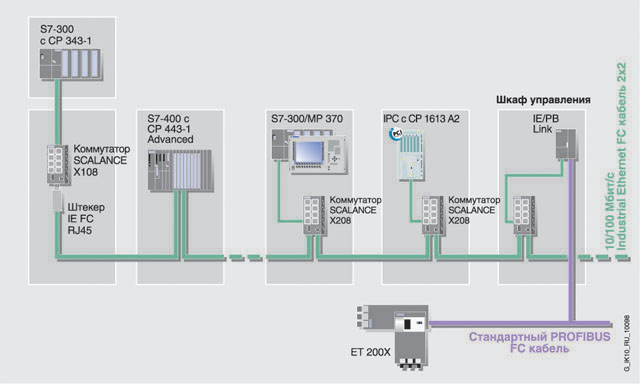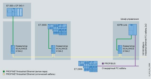 В типовом варианте модуль SCALANCE X 100 устанавливается в один шкаф управления со всеми подключаемыми узлами сети. Все коммутаторы серии позволяют создавать линейные и звездообразные топологии сети Industrial Ethernet с электрическими и оптическими каналами связи.