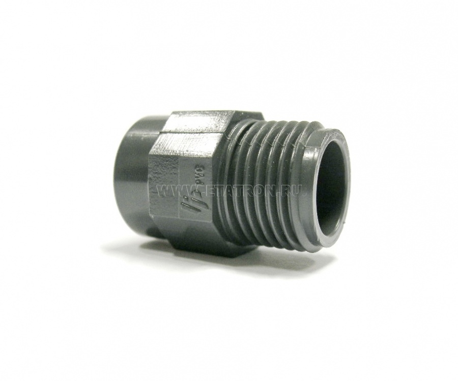 Универсальный переходной ниппель 1/2"GM – 3/8"GF. Материал исполнения: ПВХ. Предназначен для установки клапанов впрыска 3/8” в зажимное седло (седелку) 1/2''- DN50/DN63
