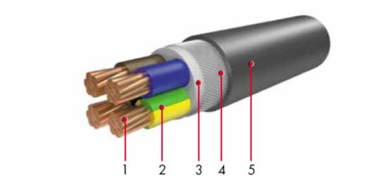 Многожильный медный кабель с ПВХ изоляцией с броней из стальной проволоки, в оболочке из ПВХ.