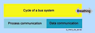 Цикл шины состоит из передачи данных процесса и ациклического обмена данными. Цикл шинной системы гораздо короче обмена данными. Говорят: цикл шины «дышит» (меняет свою длину). Однако, это «дыхание» не подходит для высокоточных применений в приводной технике.