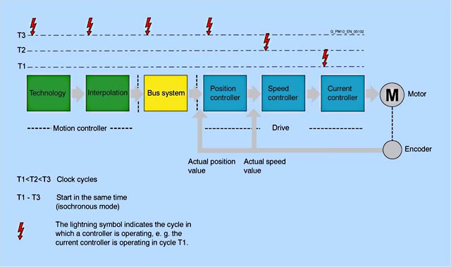 Большинство современных приводов имеет цифровые системы замкнутого управления. Эти системы управления отвечают за то, что регулируемая переменная привода, скорость или положение, достигаются и поддерживаются. Подобные цифровые системы управления содержат несколько связанных регуляторов (положения, скорости, тока…). Они должны работать согласовано, то есть быть синхронизированы между собой. Синхронизация очень важна для поддержания стабильности управления и получения точности регулирования контролируемой величины или для быстрого достижения этого. Если некоторые компоненты этой системы управления расположены вне привода, должна применяться шинная система, которая будет управлять коммуникациями между этими компонентами. Эта шинная система должна быть синхронизируемой с регуляторами системы управления. Это называют тактовой синхронизацией или изохронным режимом. Для приводов из области систем управления движением эта тактовая синхронизация должна работать максимально быстро и очень точно. Она гарантирует, что длина цикла шины изменяется крайне мало. При этом не говорят о «дыхании» цикла шины (большие изменения), а говорят о «дрожании» (незначительные изменения). Допустимые значения менее 1мкс. Такая синхронизация