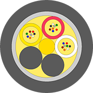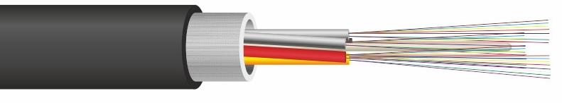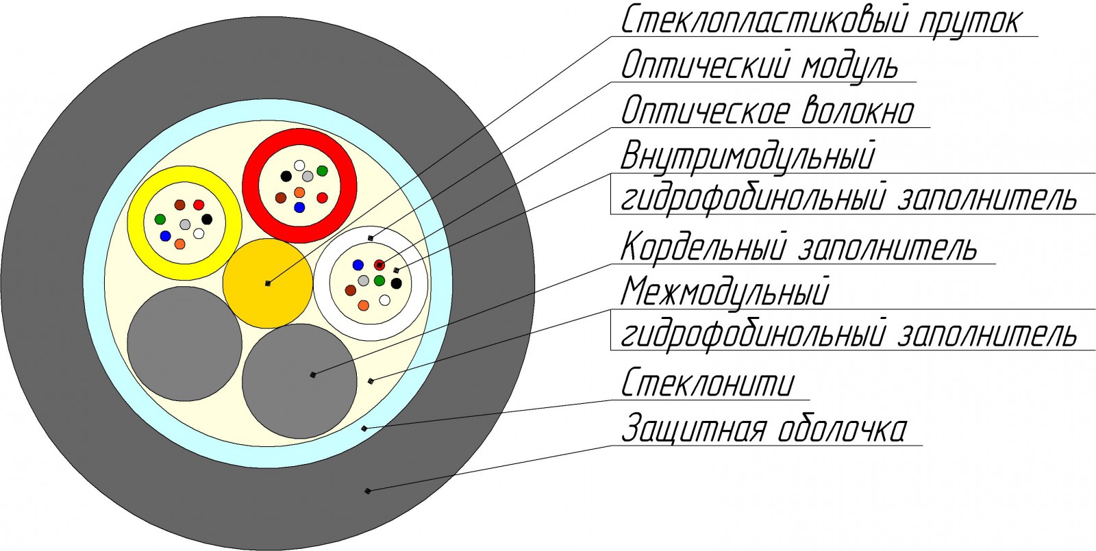 Кабель содержит сердечник модульной конструкции с центральным силовым элементом из стеклопластикового прутка, вокруг которого скручены (модули и кордели) методом правильной знакопеременной (SZ) скрутки. Внутри оптических модулей свободно уложены оптические волокна. Свободное пространство внутри оптических модулей и межмодульное пространство заполнено гидрофобным заполнителем. Сердечник скреплен нитями. На сердечник наложена ПЭТ лента, закрепленная нитью. Поверх скрутки наложен армирующий повив из стеклонитей. Защитная оболочка – полиэтилен высокой плотности.