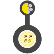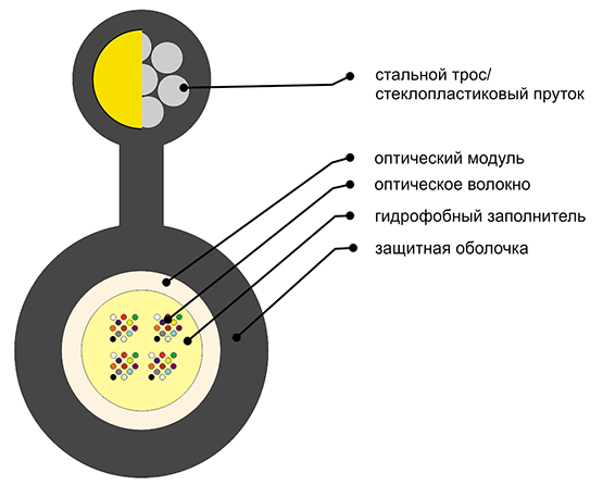 Несущий элемент расположен продольно к сердечнику. Кабель состоит из сердечника – модуля. Внутри оптического модуля свободно уложены оптические волокна. Свободное пространство внутри оптического модуля заполнено гидрофобным заполнителем. Одновременно поверх сердечника и несущего элемента накладываются оболочки. Оболочки сердечника и несущего элемента, стального каната, соединены вдоль общей образующей и выполнены из полиэтилена высокой плотности. При количестве волокон более 12 для идентификации используется кольцевая покраска и/или группирование в пучки с помощью идентификационных нитей.