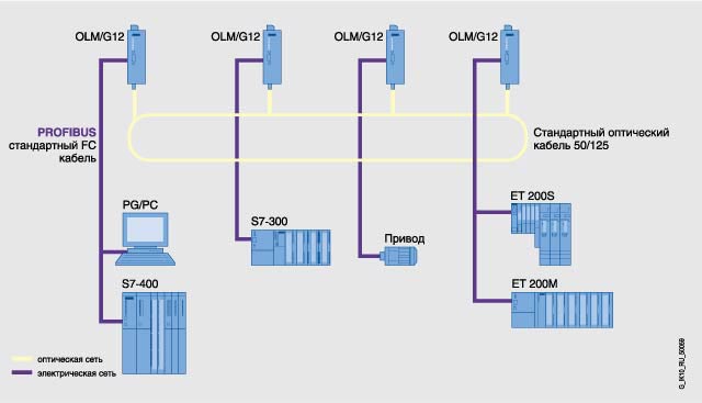 С помощью модулей OLM к оптическим линиям связи могут подключаться PROFIBUS станции, оснащенные электрическим интерфейсом RS 485. Эти же модули выполняют роль согласующих устройств между электрическими и оптическими сегментами сети PROFIBUS.