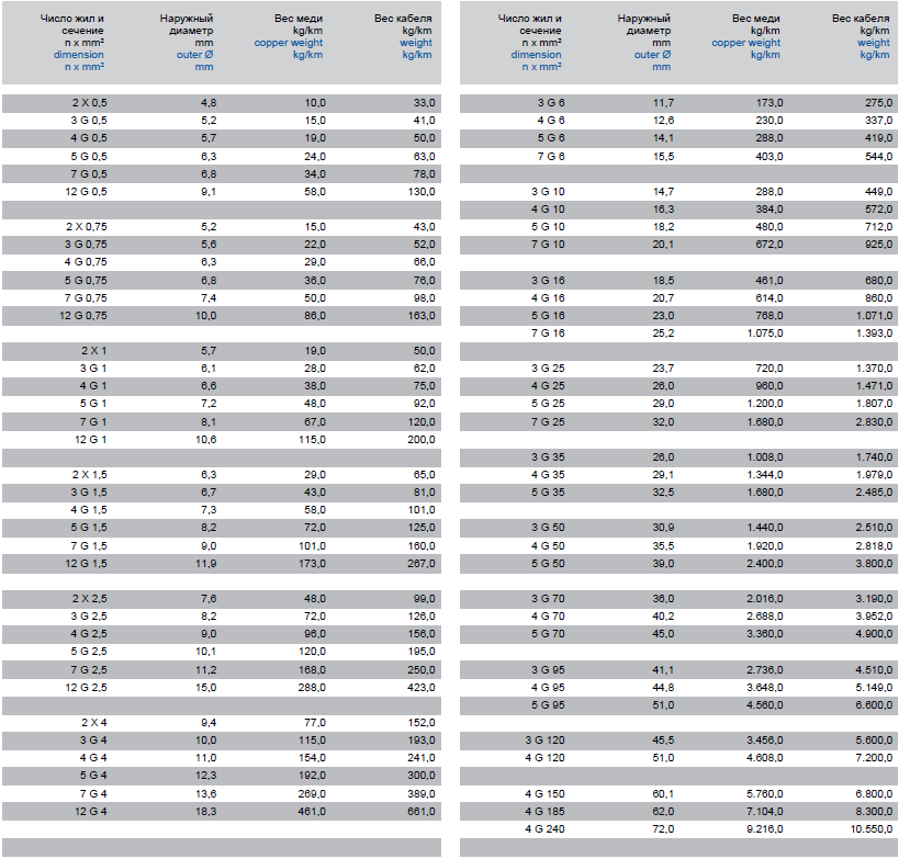 | Артикул | Название | Информация | Диаметр | Размеры | Вес меди | Вес кабеля |