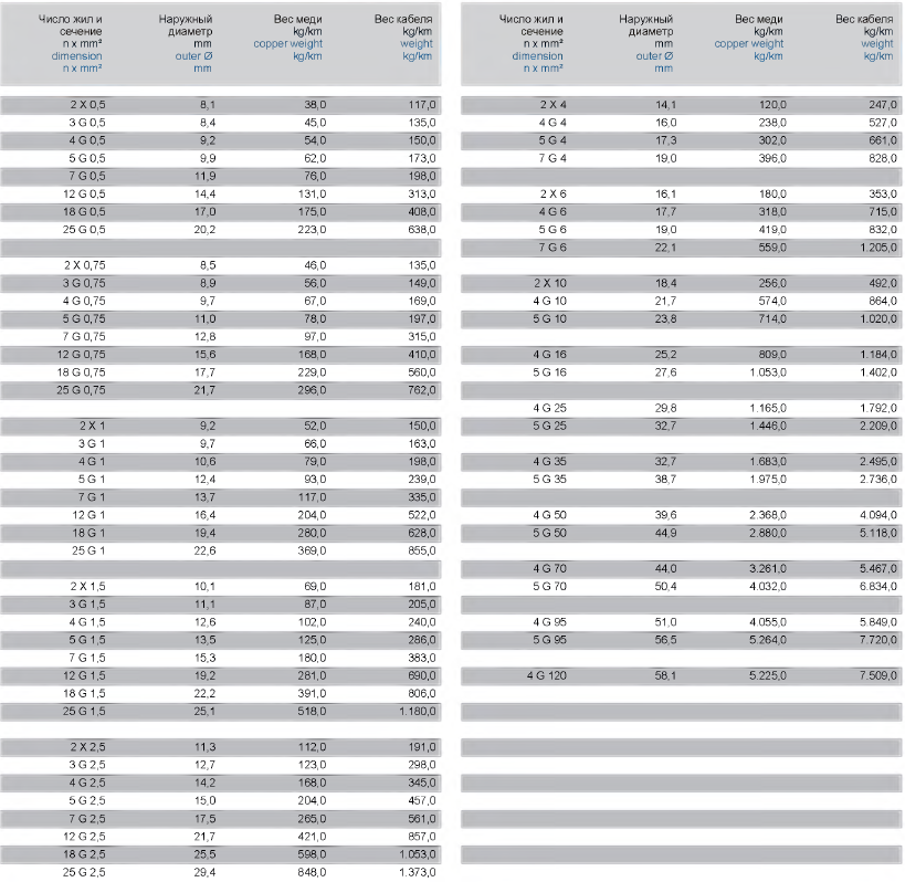 | Артикул | Название | Информация | Диаметр | Размеры | Вес меди | Вес кабеля |