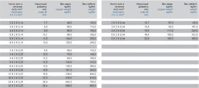 | Артикул | Название | Информация | Диаметр | Размеры | Вес меди | Вес кабеля |