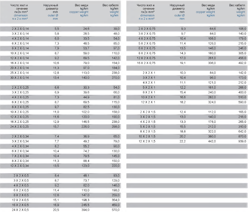 | Артикул | Название | Информация | Диаметр | Размеры | Вес меди | Вес кабеля |