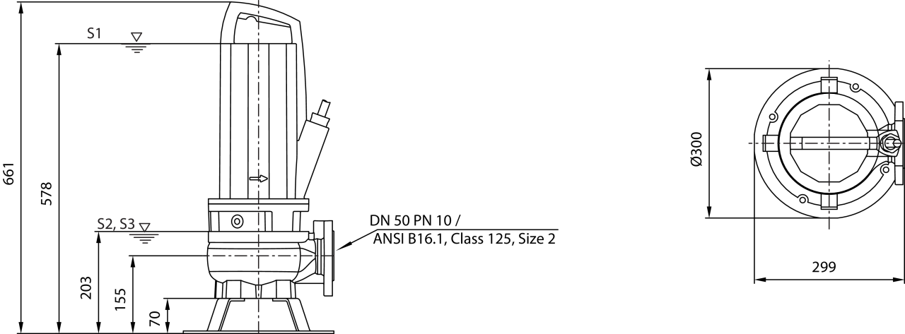Полностью затапливаемый погружной насос для отвода сточных вод для стационарной и мобильной установки в погруженном состоянии, для перекачивания загрязненной воды и сточных вод с фекалиями. Гидравлический корпус, рабочее колесо и корпус электродвигателя из серого чугуна. Электродвигатель насоса с сухим ротором в трехфазном исполнении с камерой уплотнений, датчиком контроля температуры обмотки электродвигателя и контролем герметичности камеры электродвигателя. Уплотнение со стороны перекачиваемой жидкости и со стороны электродвигателей осуществляется двумя скользящими торцовыми уплотнениями независимо от направления вращения. Кабель электропитания длиной 10 м с кабельным вводом с продольной герметизацией. Все агрегаты серийно со взрывозащитой.