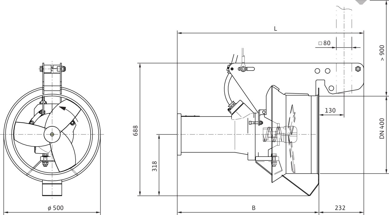 Тип пропеллера3-лопастный пропеллер с самоочищающейся ступицей; изогнут в обратном направлении; благодаря этому защищен от засорения и наматывания