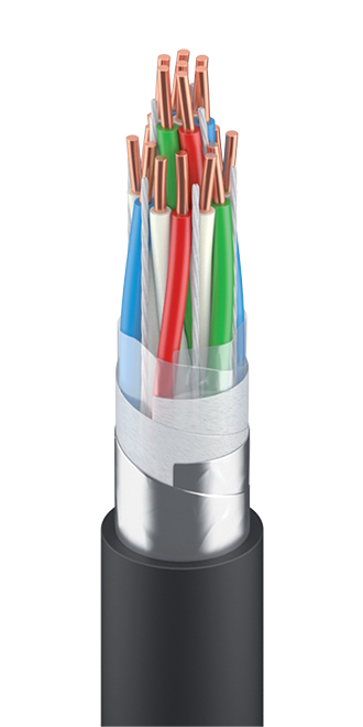 Кабель для сигнализации и блокировки с токопроводящими жилами из мягкой медной проволоки, с изоляцией из полимерной композиции, не содержащей галогенов, с ВБ элементами, с поясной изоляцией из ПЭТ-Э плёнки, с общим экраном из алюмофлекса, с оболочкой из полимерной безгалогеновой композиции