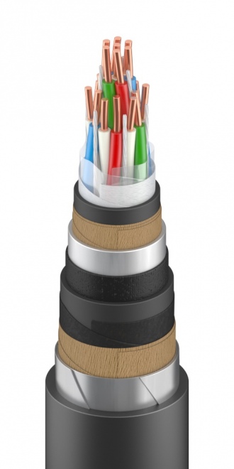 Кабель для сигнализации и блокировки, с медными жилами, с изоляцией из полиэтилена, с водоблокирующими материалами, в алюминиевой оболочке, с броней из двух стальных лент, в защитном шланге из полиэтилена