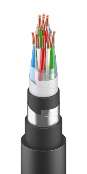 Кабель для сигнализации и блокировки, с медными жилами, с изоляцией из полиэтилена, с водоблокирующими материалами, с экраном из алюмополимерной ленты, в утолщённой оболочке из полиэтилена