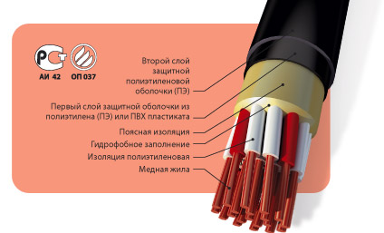 пониженная рабочая температура -50 °С — для кабелей в ПЭ оболочке, -40 °С — для кабелей в ПВХ оболочке и ПВХ оболочке пониженной горючести;