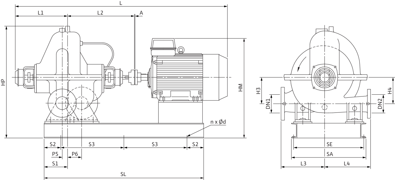 Одно- или двухступенчатый нормальновсасывающий центробежный насос с аксиально разделенным корпусом насоса. Корпус насоса спиральной формы, состоит из двух литых частей, соединенных болтами вдоль оси насоса.