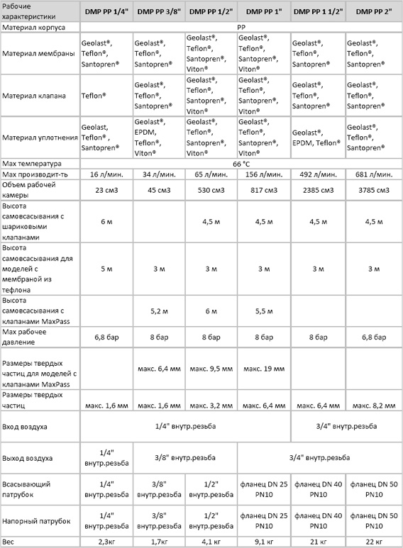 Модельный ряд мембранных насосов серии DMP PP включает в себя следующие типоразмеры: от ¼“ до 2»