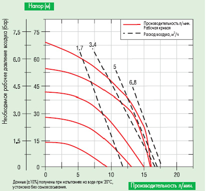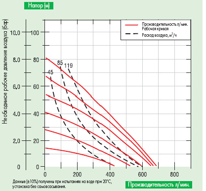 Кривые производительности насосов мембранных (рабочие кривые) для моделей 3/8»