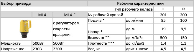 Комплектуются насосы различными типами приводов: электродвигателями от 460 до 795 Вт и пневмодвигателями 400 Вт.