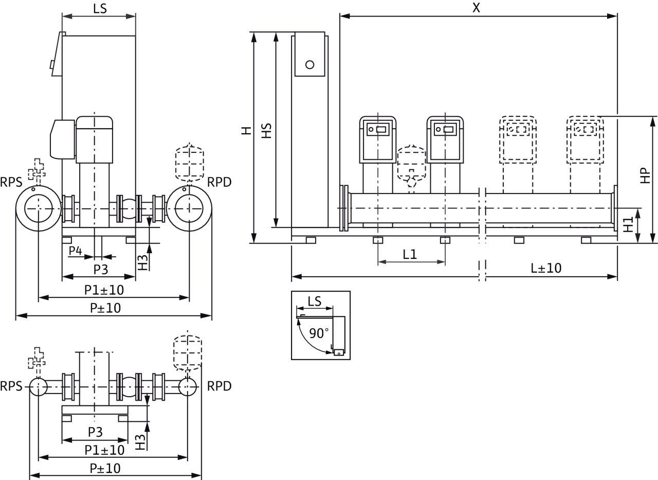 - Автоматическое, зависимое от нагрузки подключение от 1 до n насос(ов) пиковой нагрузки в зависимости от регулируемых величин давления: постоянное, p-c