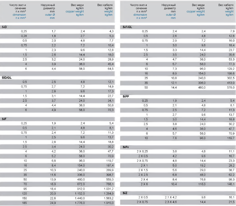 согл. DIN VDE 0295 соотв. IEC 60228 (SiD и SID/GL: однопроволочная жила, SiF, SiF/GL & SIFv: кл. 5; SiFF: кл. 6 графа 4; SiZ: кл. 6 графа4) |