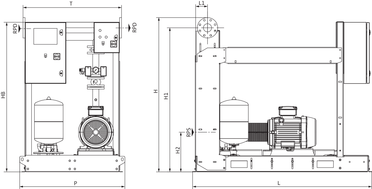 Состоит из основного насоса с горизонтальной опорной рамой (EN 733), со сменной муфтой, электродвигателем и многоступенчатым вертикальным подпитывающим электронасосом, мембранным напорным резервуаром (емкость: 20 л), а также распределительным шкафом для каждого насоса, закрепленным на прочной поддерживающей конструкции.