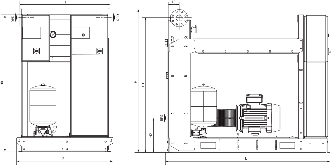 Состоит из основного насоса с горизонтальной опорной рамой (EN 733), со сменной муфтой, электродвигателем и многоступенчатым вертикальным подпитывающим электронасосом, мембранным напорным резервуаром (емкость: 20 л), а также распределительным шкафом для каждого насоса, закрепленным на прочной поддерживающей конструкции.