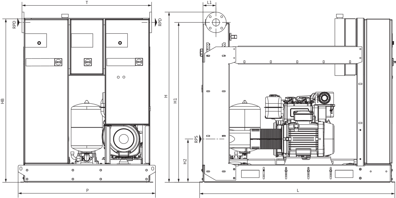 Состоит из 2 насосов (основной/резервный), один из которых оснащен электродвигателем, а другой — дизельным двигателем, с горизонтальной опорной рамой (EN 733) и сменной муфтой, многоступенчатым вертикальным подпитывающим электронасосом, мембранным напорным резервуаром (емкость: 20 л), а также распределительным шкафом для каждого насоса, закрепленным на прочной поддерживающей конструкции.
