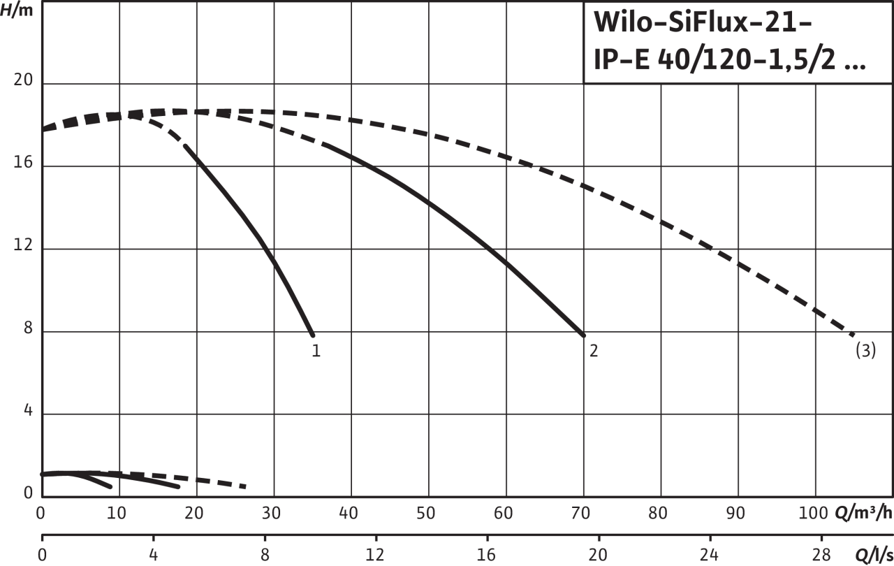 Эксплуатация всей системы SiFlux, включая резервный насос (штрихованная характеристика), в стандартном исполнении не предусмотрена. Резервный насос служит исключительно в качестве запасного агрегата при сбое одного из рабочих насосов (характеристика 1 и 2).