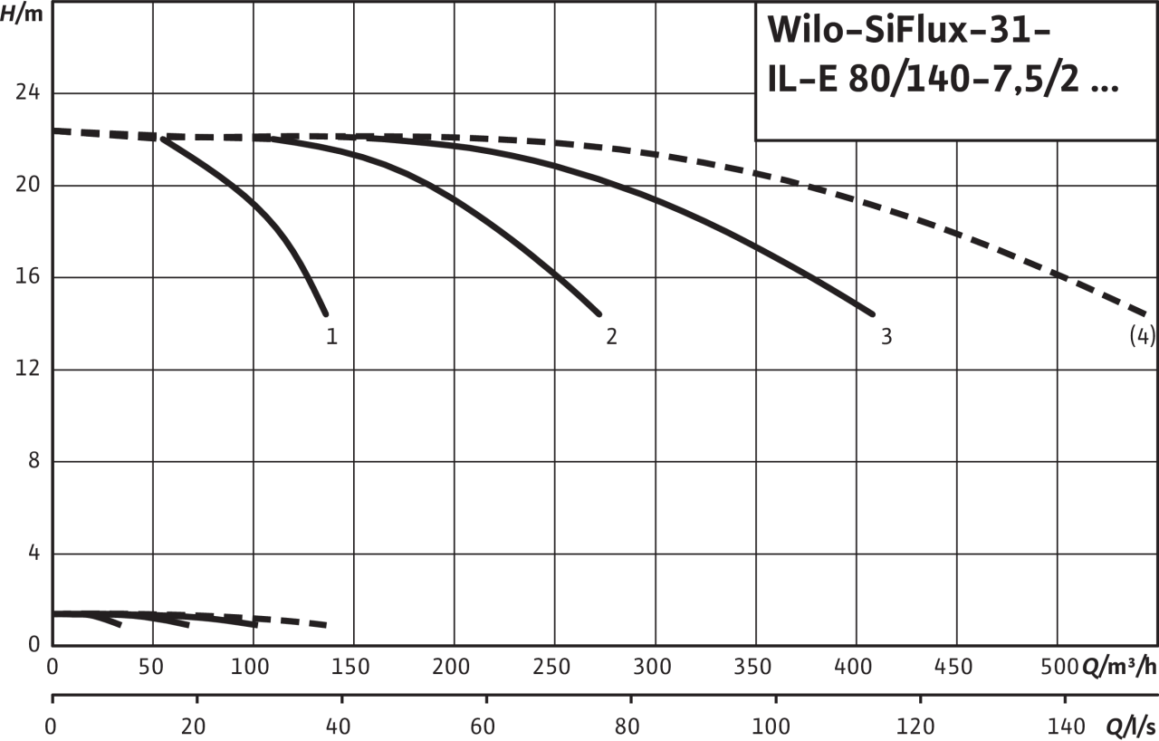 Эксплуатация всей системы SiFlux, включая резервный насос (штрихованная характеристика), в стандартном исполнении не предусмотрена. Резервный насос служит исключительно в качестве запасного агрегата при сбое одного из рабочих насосов (характеристика 1 и 2 и соответственно 3).