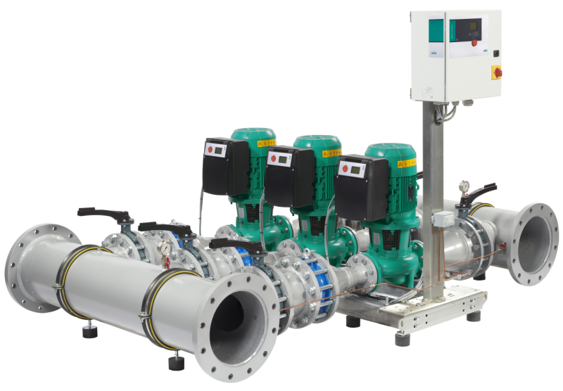 Высокоэффективная, предварительно смонтированная многонасосная установка для применения в системах отопления и кондиционирования, состоящая из опорной плиты с амортизаторами колебаний, фланцевыми распорками, 2 покрытыми лакокрасочным покрытием стальными распределителями с манометрами со стороны всасывания и нагнетания, энным количеством электронно регулируемых линейных насосов (включая 1 резервный насос), прибором управления SCe-HLKK с соединением, обратными клапанами со стороны конечного давления, ручными запорными клапанами, контрфланцами с уплотнением со стороны давления наддува и со стороны конечного давления, конусами и датчиком перепада давления с соединительными трубопроводами.