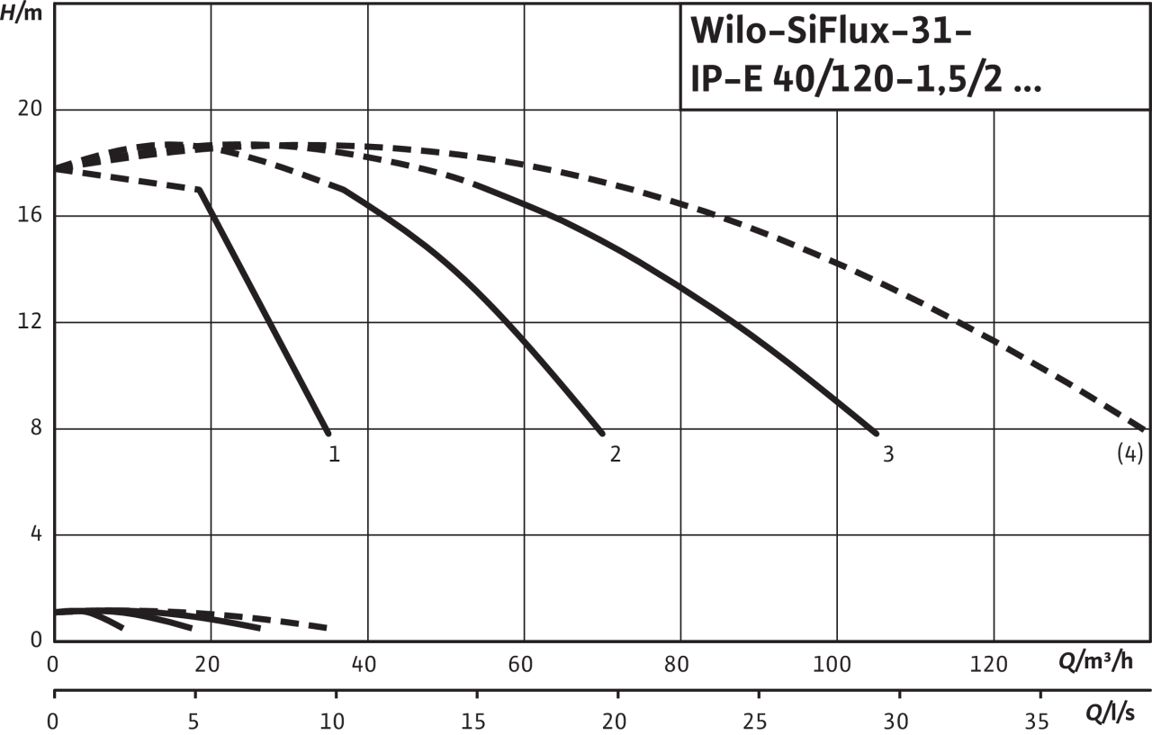Эксплуатация всей системы SiFlux, включая резервный насос (штрихованная характеристика), в стандартном исполнении не предусмотрена. Резервный насос служит исключительно в качестве запасного агрегата при сбое одного из рабочих насосов (характеристика 1 и 2 и соответственно 3).