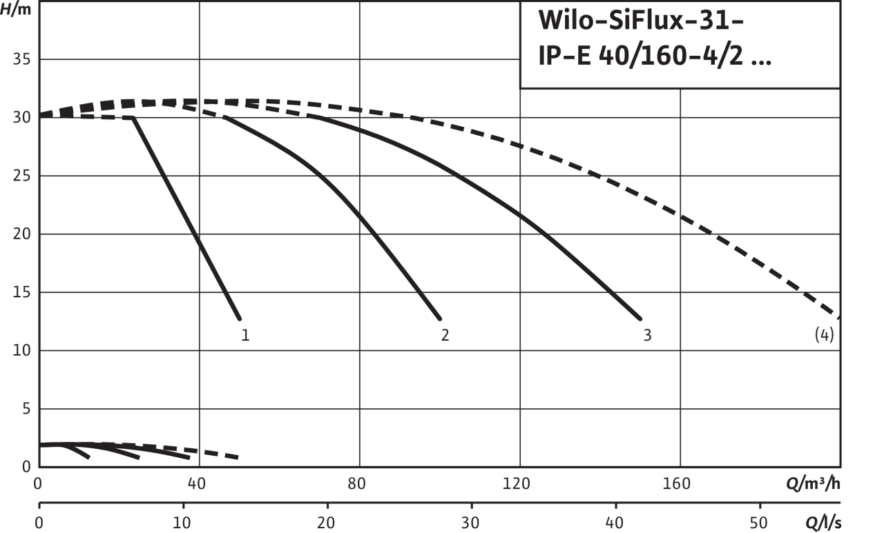 Эксплуатация всей системы SiFlux, включая резервный насос (штрихованная характеристика), в стандартном исполнении не предусмотрена. Резервный насос служит исключительно в качестве запасного агрегата при сбое одного из рабочих насосов (характеристика 1 и 2 и соответственно 3).