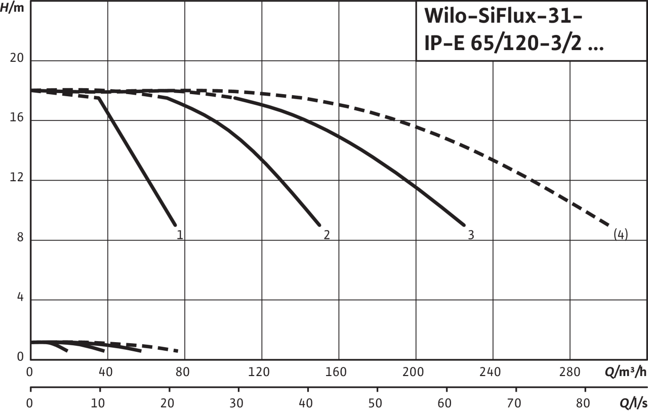 Эксплуатация всей системы SiFlux, включая резервный насос (штрихованная характеристика), в стандартном исполнении не предусмотрена. Резервный насос служит исключительно в качестве запасного агрегата при сбое одного из рабочих насосов (характеристика 1 и 2 и соответственно 3).