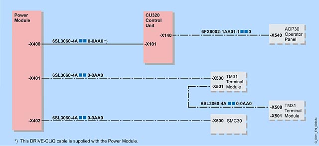 Коммуникация между блоком управления CU320, силовым модулем и другими активными компонентами SINAMICS происходит через DRIVE-CLiQ — внутренний последовательный интерфейс двигателя. Для этого доступны заранее смонтированные кабели.