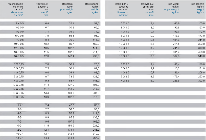 согл. VDE 0293-308 до 5 жил: цветная маркировка, более 6 жил: черные жилы с белой цифровой маркировкой, с желто-зеленой жилой |