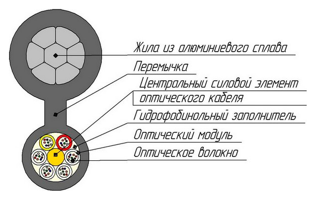 Данная конструкция кабеля выполнена в виде «8» и состоит из токопроводящей жилы и сердечника оптического кабеля. Токопроводящая жила выполнена из проволок алюминиевого сплава и уплотнена.