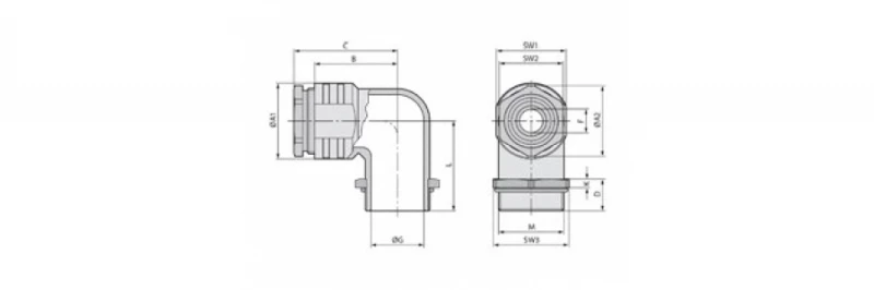 | Артикул | Наименование | Диапазон зажима ØF мм | L | SW1 | Ø A1 | SW2 | Ø A2 | Ø G |
