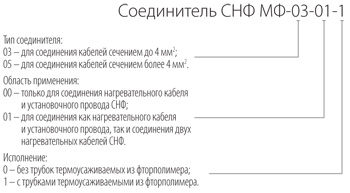 | СНФ МФ-03-01-1 | Соединитель для соединения нагревательных кабелей и установочных проводов сечением меньше 4 мм² и для соединения двух кабелей |