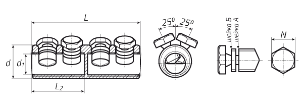 | Наименование | Сечение (мм²) | L(мм) | L2(мм) | d(мм) | d1(мм) | N(мм) | болтов |