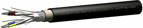 | Пары с многопроволочными медными лужеными жилами сечением от 0,5 до 2,5 мм² с изоляцией из полимерной композиции пониженной пожарной опасности, в индивидуальном экране из алюмолавсановой ленты с контактным проводником из медной лужёной проволоки; общий экран из алюмолавсановой ленты с контактным проводником из медной лужёной проволоки и в оплётке из медных лужёных проволок плотностью 40%. Оболочка из ПВХ пластиката пониженной пожароопасности (СКАБ 250нг (А)-LS) или полимерной композиции, не содержащей галогенов (СКАБ 250нг (А)-HF-ХЛ). |
